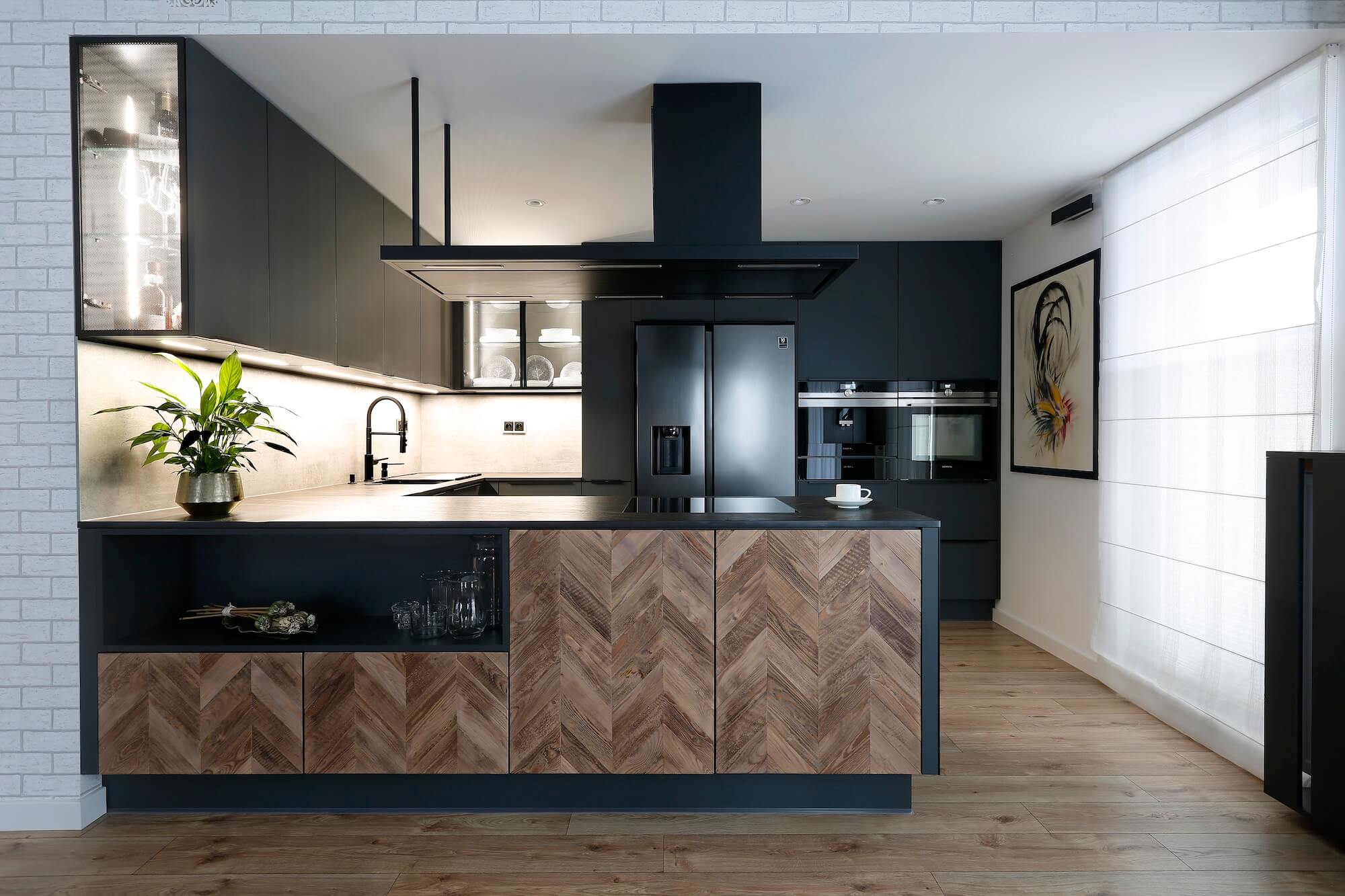 Dzisiejsze wnętrze, które prezentujemy, stanowi apogeum współczesnego designu i precyzyjnego rzemiosła. Ta elegancka, ciemna kuchnia została zaprojektowana z myślą o szczegółach, co jest widoczne w każdym calu tego przemyślanego projektu. Czarny kolor mebli kuchennych nie tylko dodaje głębi i charakteru przestrzeni, ale również stanowi idealne tło dla zaawansowanych technologicznie urządzeń, które są zarówno stylowe, jak i funkcjonalne.