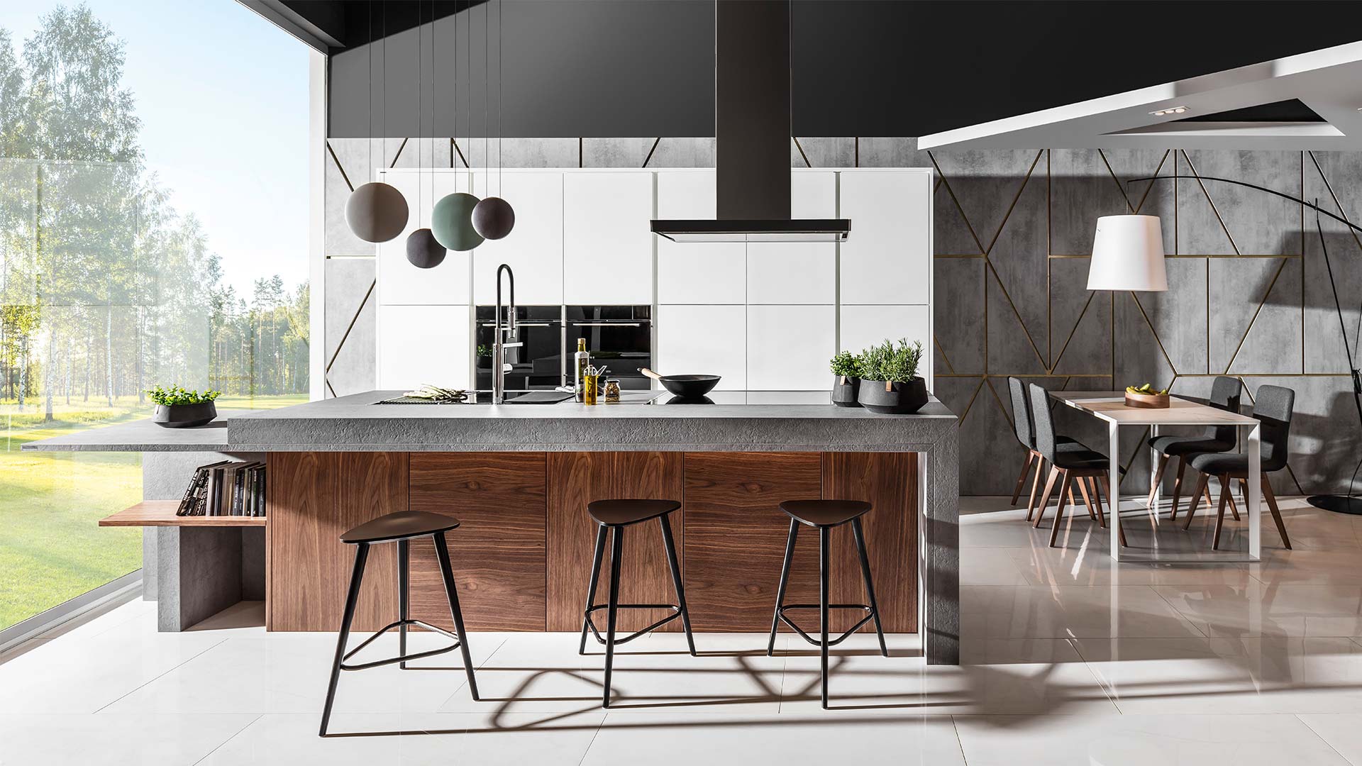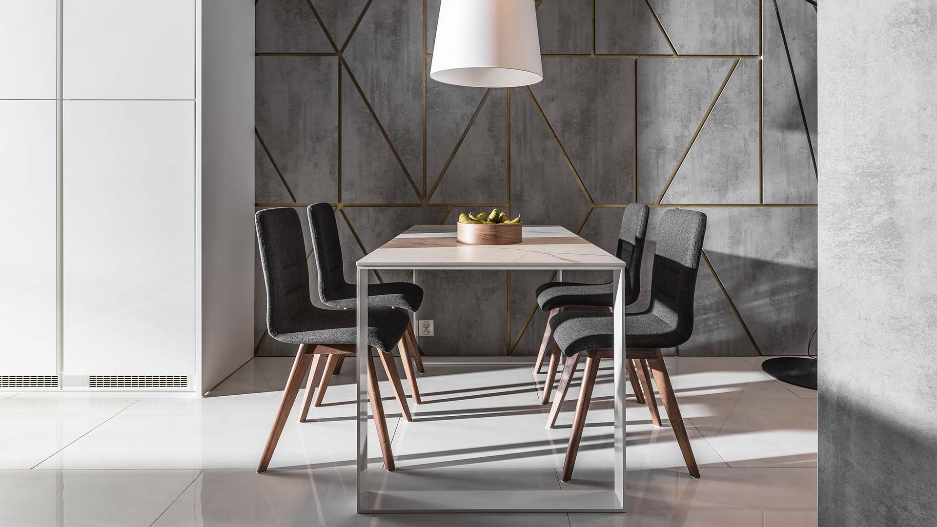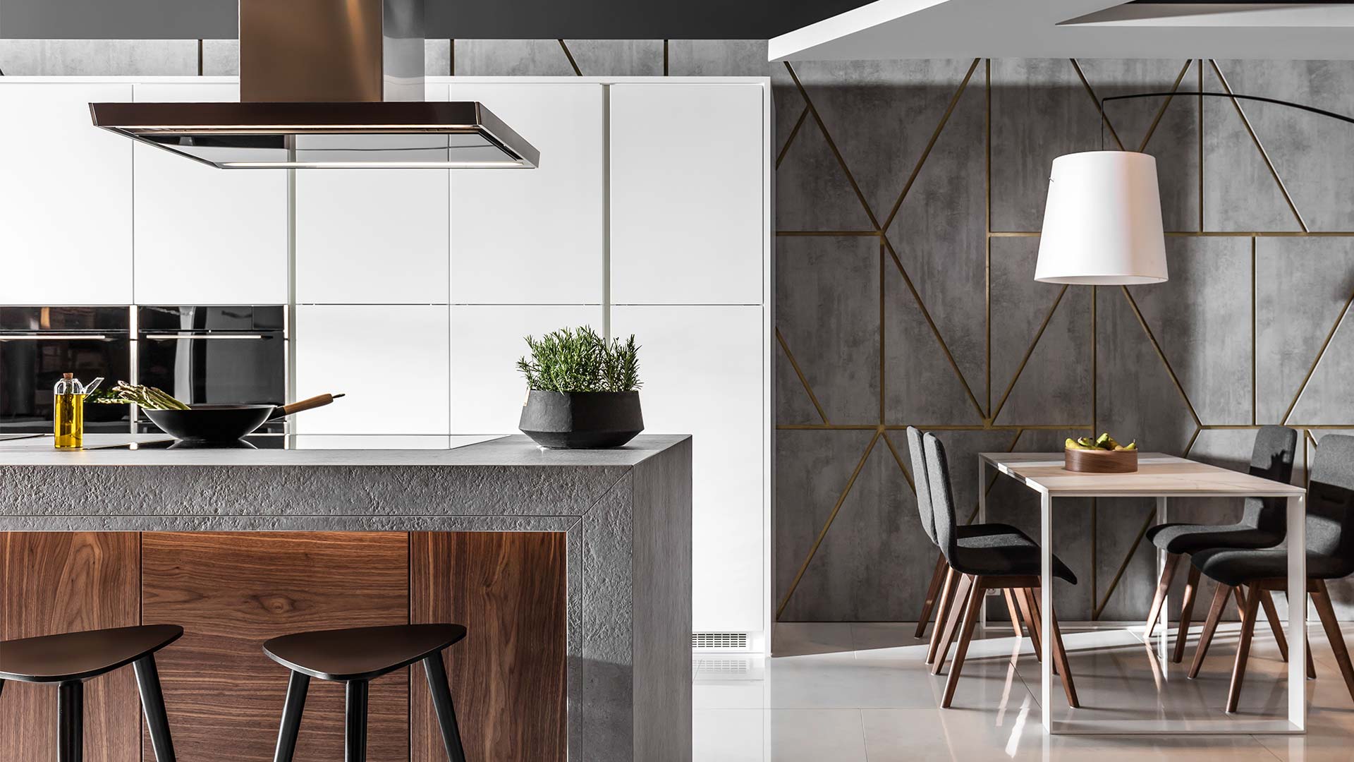 Połączenie nieprzemijającej bieli, naturalnego orzecha oraz szarego betonu wprowadza do nowoczesnego wnętrza ciepło i ład. Zestawienie geometrycznych szarych płyt na ścianie idealnie wpisuje się w styl tego pomieszczenia.