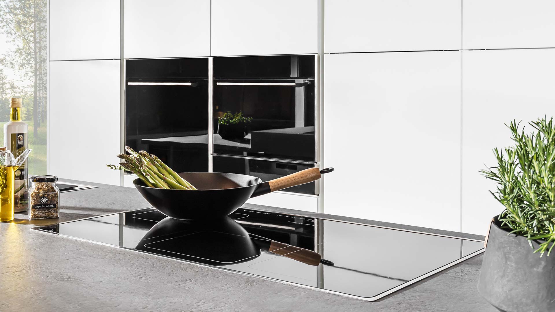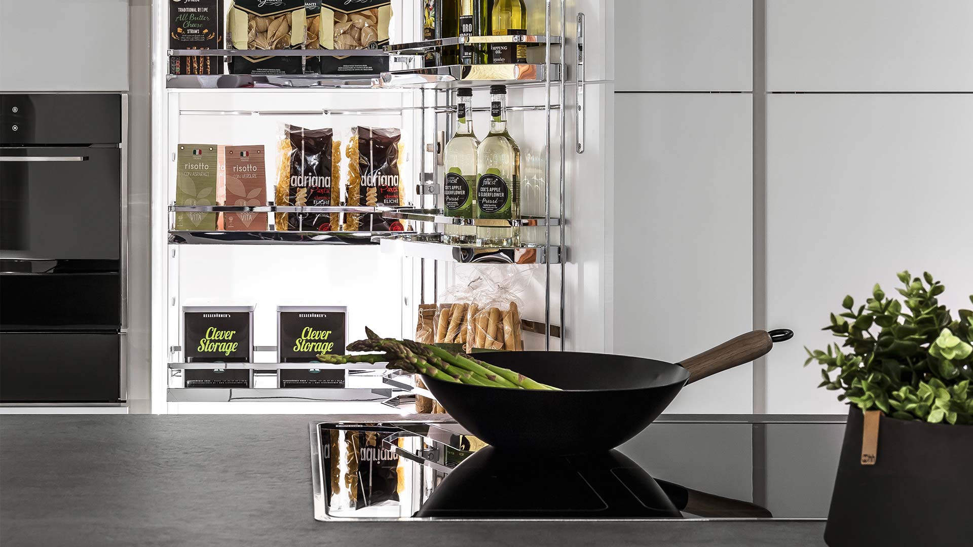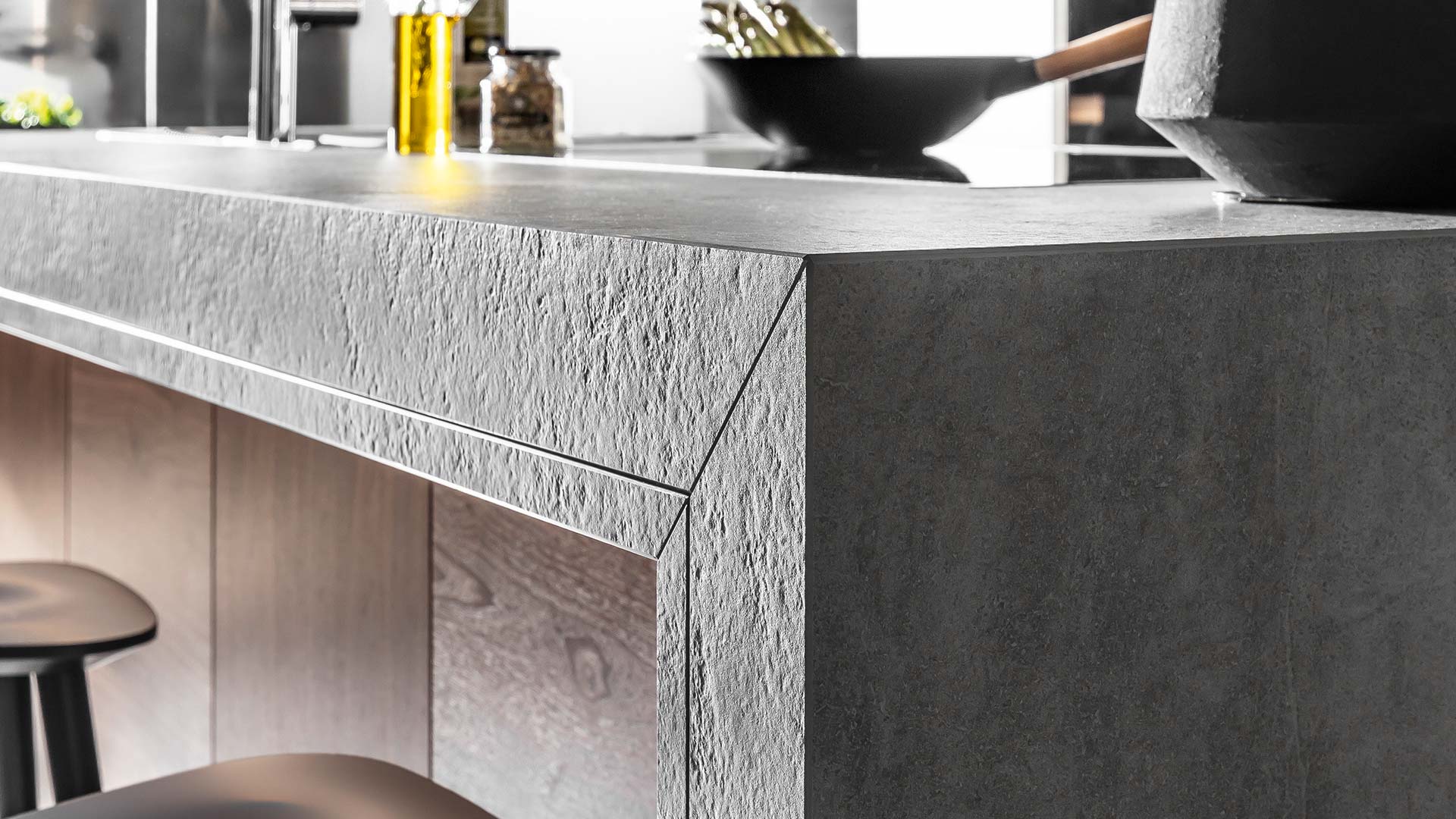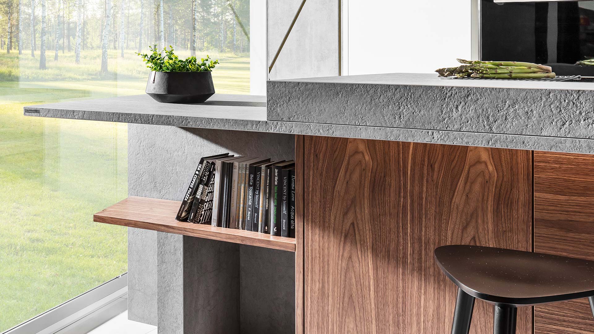 Połączenie nieprzemijającej bieli, naturalnego orzecha oraz szarego betonu wprowadza do nowoczesnego wnętrza ciepło i ład. Zestawienie geometrycznych szarych płyt na ścianie idealnie wpisuje się w styl tego pomieszczenia.