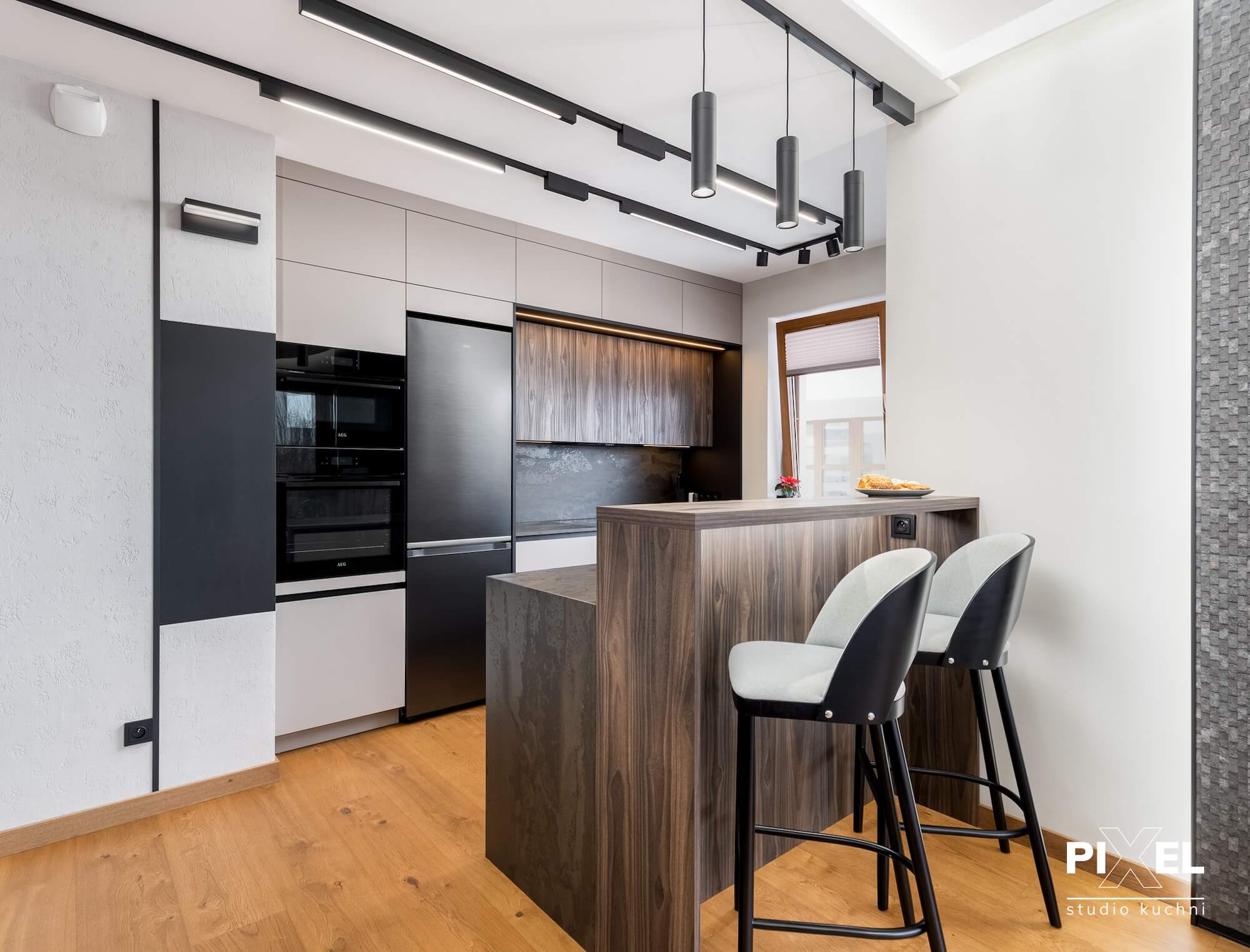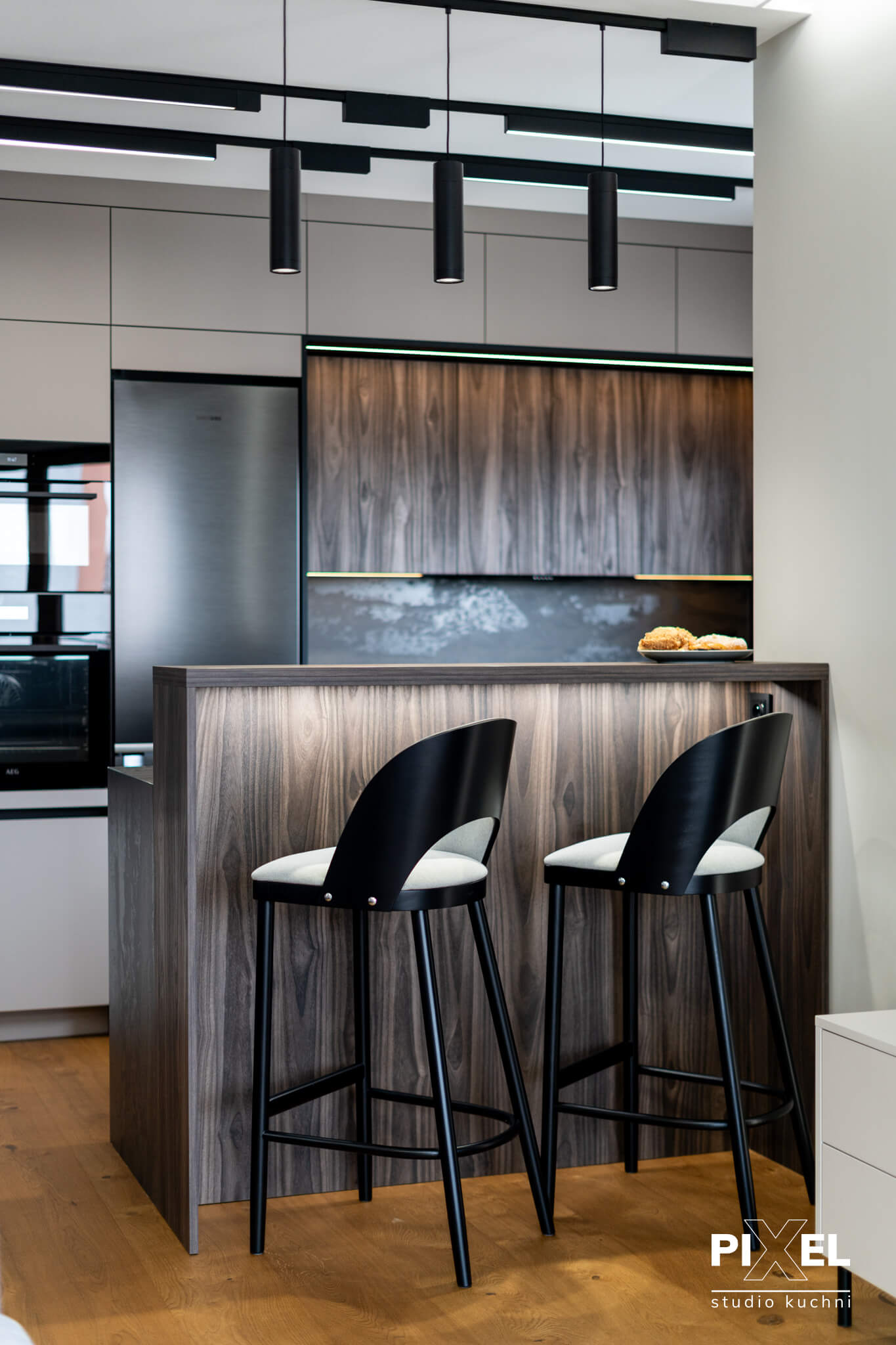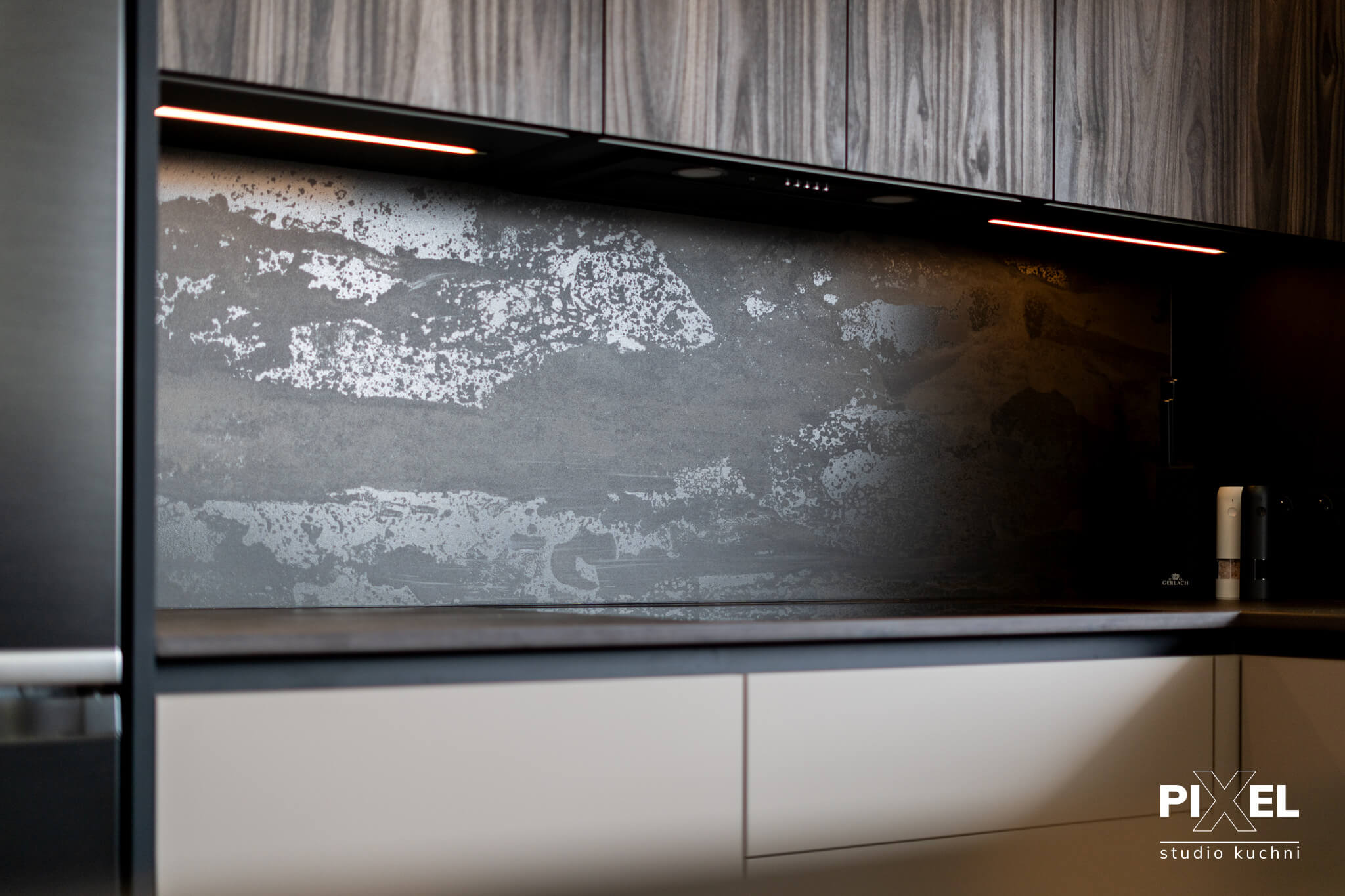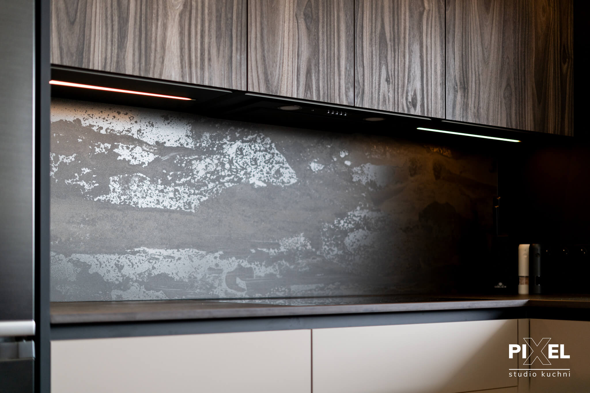 Prezentowana kuchnia to przykład rzemiosła na najwyższym poziomie, gdzie każdy detal został starannie przemyślany i wykonany na zamówienie przez firmę Pixel. Specjalizujemy się w tworzeniu mebli kuchennych na wymiar, które odpowiadają najnowszym trendom w designie, a także indywidualnym preferencjom naszych klientów.
