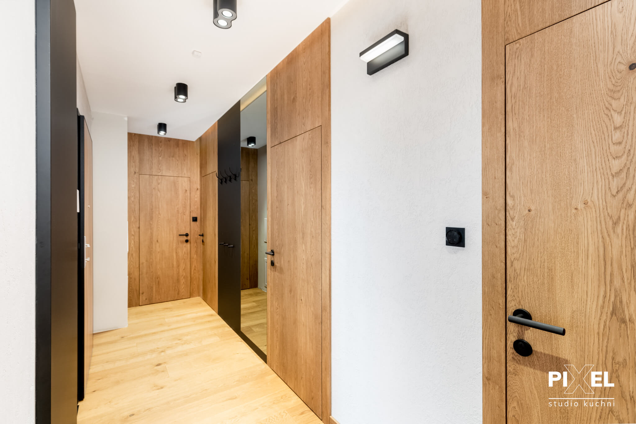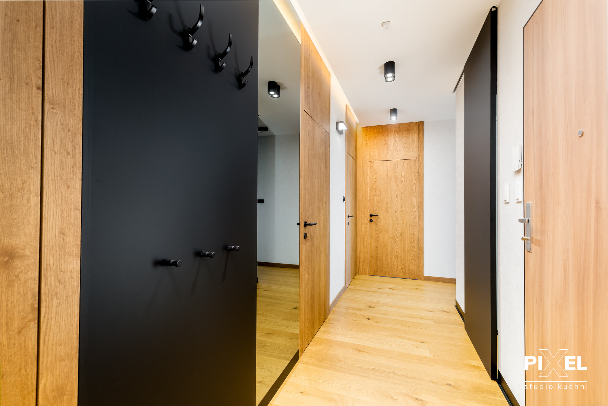 Wykonaliśmy dla naszego klienta niebanalne rozwiązanie aranżacyjne, które jest nie tylko praktyczne, ale również elegancko współgra z nowoczesnym wnętrzem. Specjalizując się w projektowaniu na wymiar, firma Pixel przygotowała zabudowę wnęki, która służy jako szafa. Połączenie naturalnego odcienia drewna z ciemnym, matowym wykończeniem drzwi szafy tworzy wyrafinowany kontrast, który jest zarówno funkcjonalny, jak i wizualnie atrakcyjny.